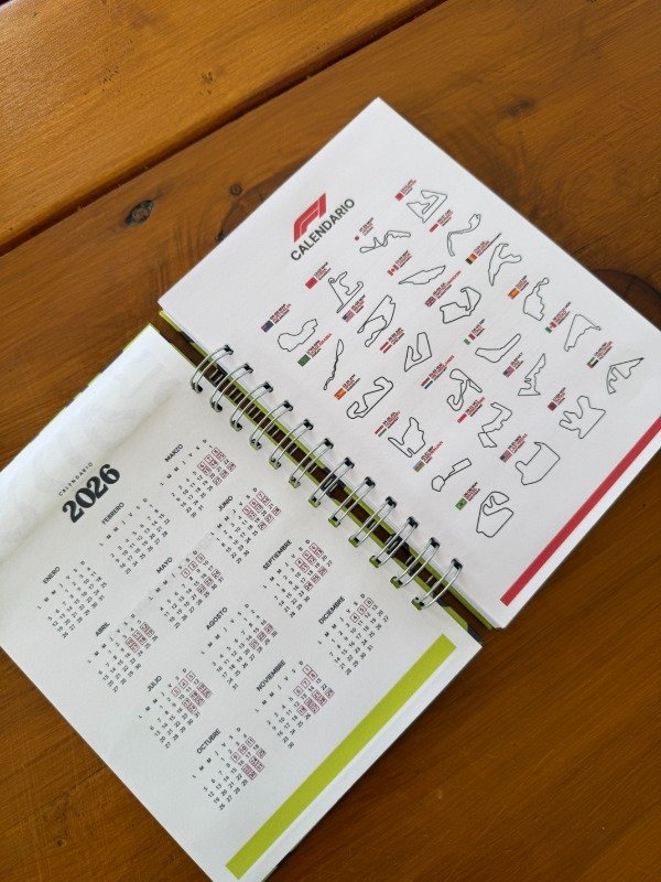 Los cuadernos son de tapa dura, en todos los de formula 1 vienen con dos calendarios, uno de todos los meses del año donde estan marcados los días que hay carrera y otro calendario de los circuitos donde especifica también las fechas de cada carrera.